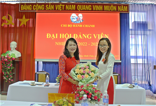 tặng hoa cho đồng chí Lâm Thị Tợi - Bí thư Chi bộ Hành chánh nhiệm kỳ 2020-2022.