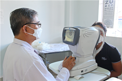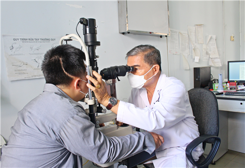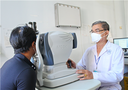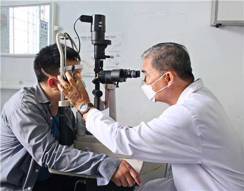 Bs CKI. Phạm Thanh Long khám thị lực cho bệnh nhân bằng máy